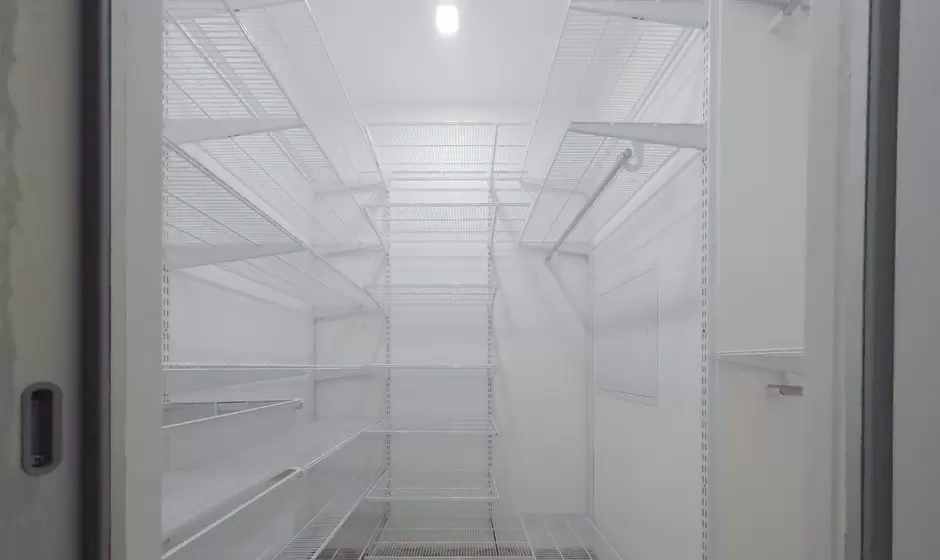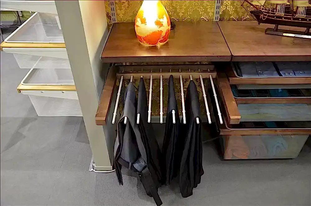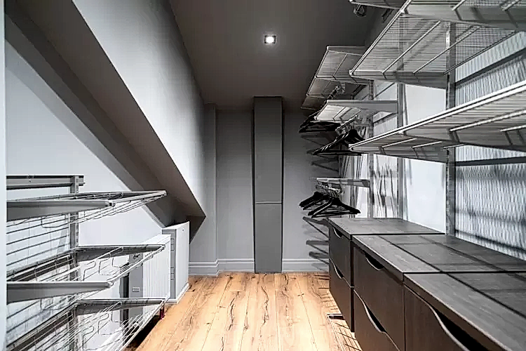 Точное изготовление гардеробной на заказ позволяет задействовать даже Pin-Up с трубой или пространство над дверью, превратив его в аккуратную полку для чемоданов.