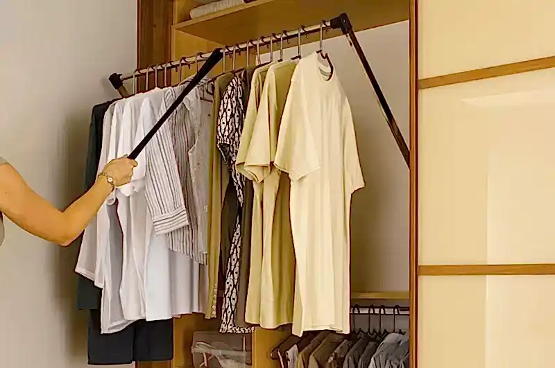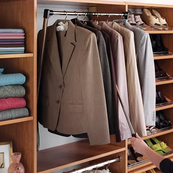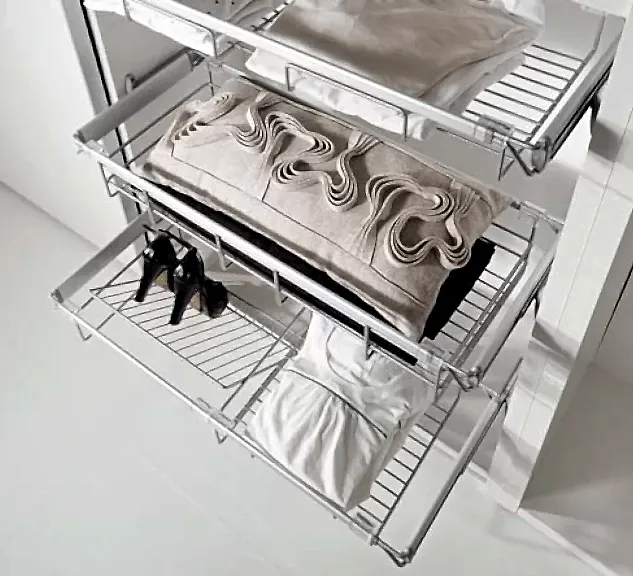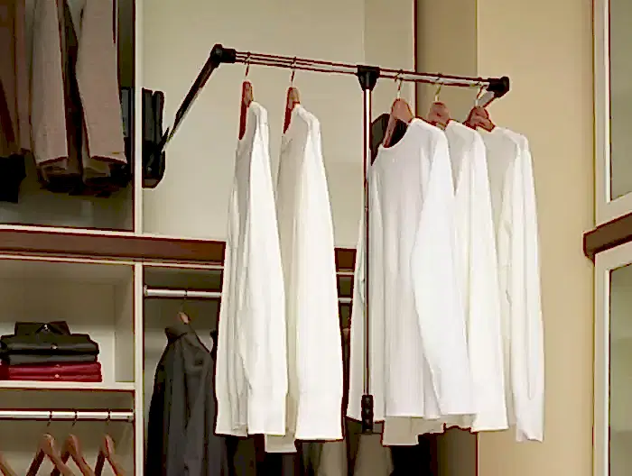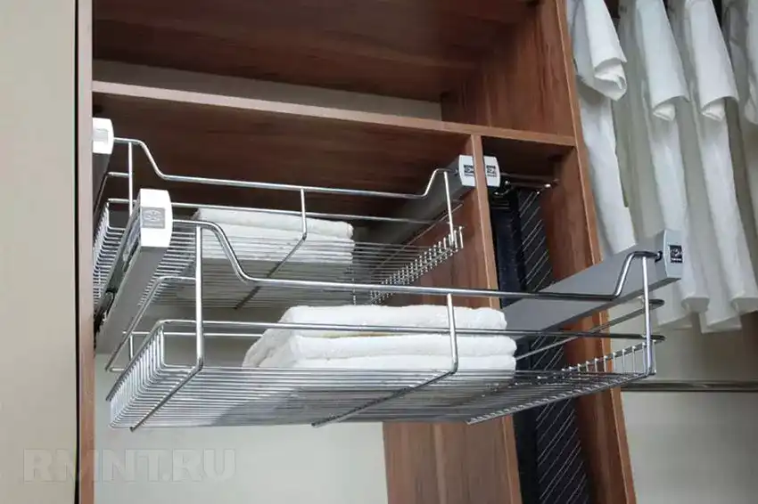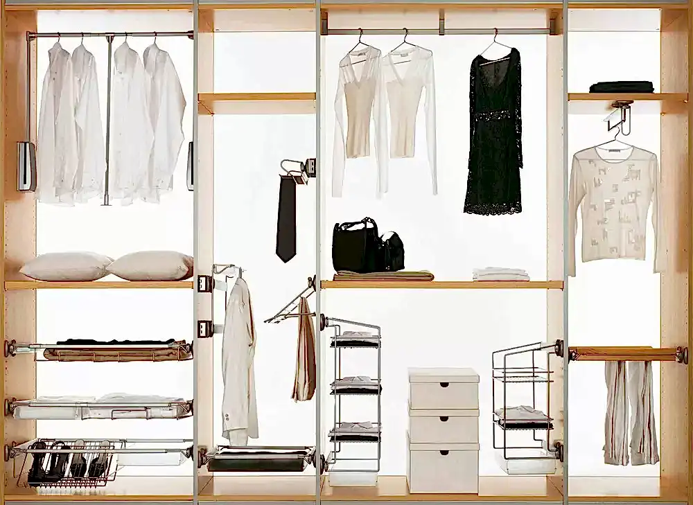 Для наполнения шкафа-купе используют различную фурнитуру - полки, корзины, вешалки, лотки, перегородки. Всё это, как правило, оснащено современными механизмами, которые позволяют по максимуму использовать доступное рабочее пространство шкафа-купе. Использование Pin-Up выдвижных и поворотных механизмов, пантографов и микролифтов позволяет значительно упростить доступ к вещам, хранимым в шкафу
